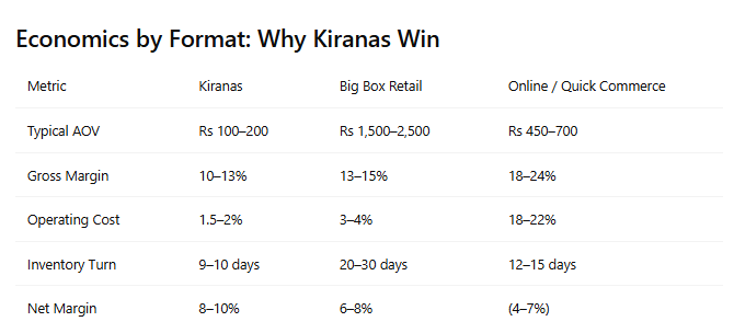 Kiranas remain viable at low AOVs because their cost structures are fundamentally different. Owned or low-rent premises, family-run staffing models, negligible marketing expenses, and minimal logistics costs allow them to operate profitably where others cannot. Rapid inventory cycles, with stock turning every 9–10 days, further improve cash flow and reduce working capital stress.