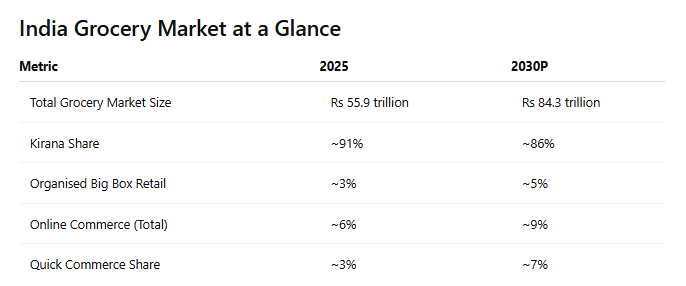 According to the Redseer report, India’s grocery market is valued at Rs 55.9 trillion in 2025 and is projected to grow to Rs 84.3 trillion by 2030. Despite the rapid growth of organised retail and digital commerce, kiranas command about 91% of the market today and are expected to retain a dominant 86% share by the end of the decade. The explanation lies in what the report terms the “AOV trap.”